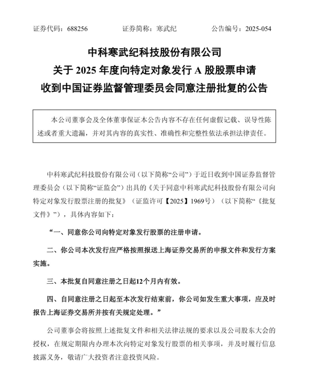 9月9日晚间,寒武纪(688256.SH)公告称,公司于近日收到证监会出具的《关于同意中科寒武纪科技股份有限公司向特定对象发行股票注册的批复》,批复同意公司向特定对象发行股票的注册申请,有效期为12个月。公司将按照相关法律法规和批复文件的要求,在规定期限内办理本次向特定对象发行股票的相关事项,并及时履行信息披露义务。